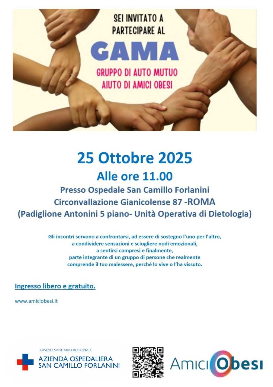 L’Ospedale San Camillo Forlanini invita tutti gli interessati a partecipare al prossimo incontro del Gruppo di Auto Mutuo Aiuto di Amici Obesi (GAMA), che si terrà sabato 25 ottobre 2025 alle ore 11.00 presso il Padiglione Antonini, 5° piano, Unità Operativa di Dietologia, in Circonvallazione Gianicolense 87, Roma.